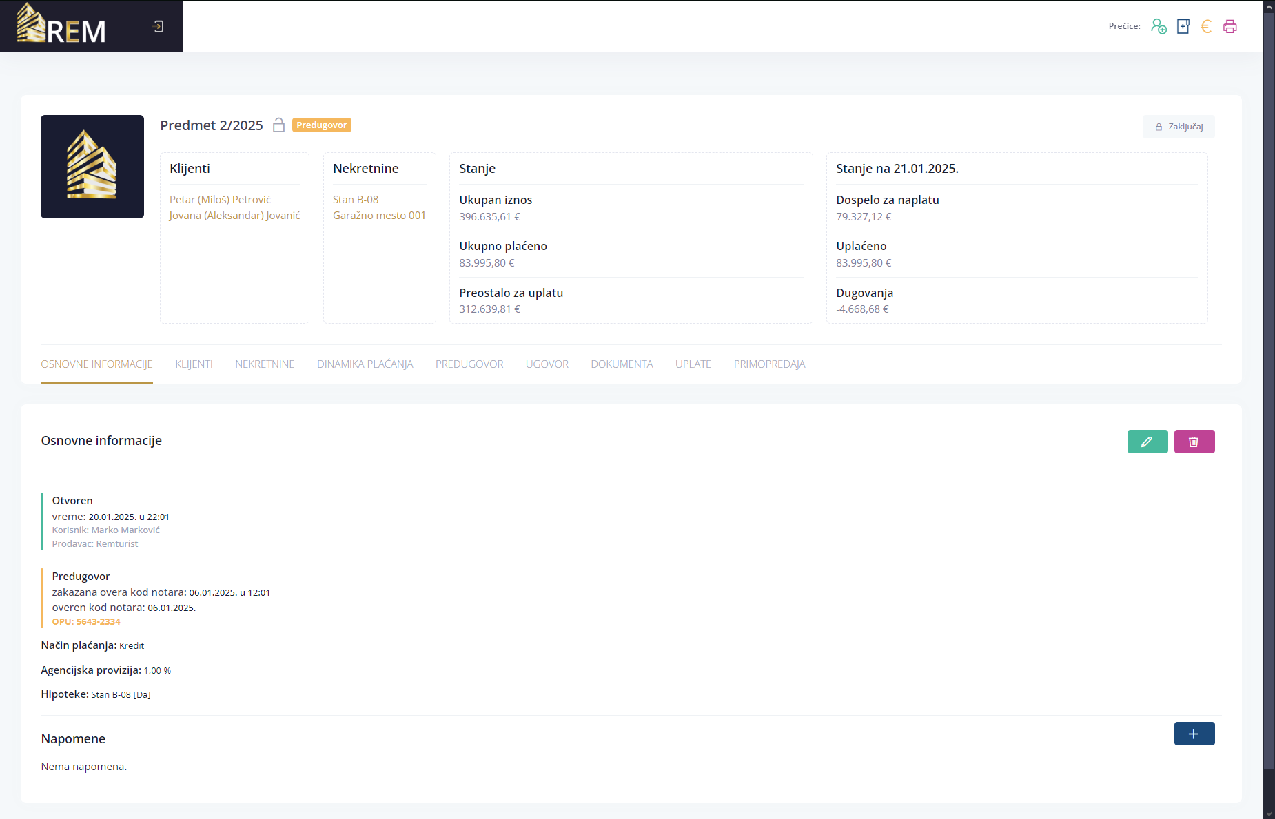 Modul Prodaja obuhvata sve ključne aspekte upravljanja prodajnim procesom, od kreiranja predmeta (klijenti, proizvodi, uslovi plaćanja) do izdavanja konačnih dokumenata. Omogućava pretragu predmeta, generisanje predugovora i ugovora, praćenje uplata kroz avansne račune, izdavanje konačnih računa, potvrda o isplati i zapisnika o primopredaji, kao i integraciju sa fiskalnom kasom. Uz to, sadrži Document Management System koji omogućava kreiranje i skladištenje svih klijentovih dokumenata.